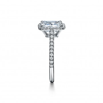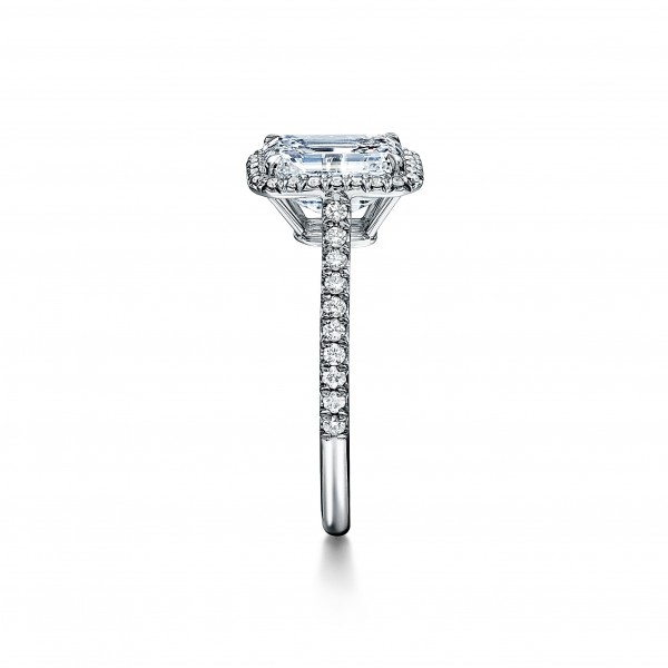 订婚钻戒璀璨夺目,如同光芒四射的骄阳一般。耀眼夺目的祖母绿形切割主钻由珠链式边镶钻石璀璨簇拥,采用同心排列的平行刻面,璀璨夺目,营造出迷人的光晕效果。