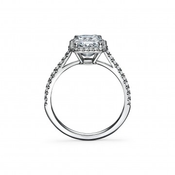 订婚钻戒璀璨夺目,如同光芒四射的骄阳一般。耀眼夺目的枕形切割主钻由双层珠链式边镶钻石璀璨簇拥,营造出迷人的光晕效果。