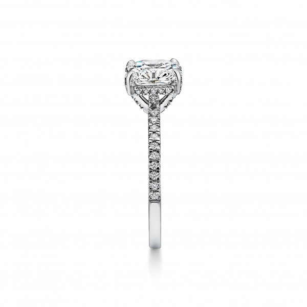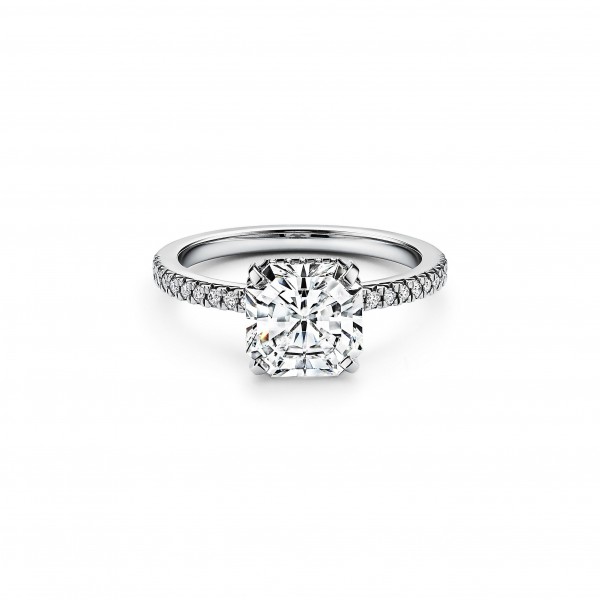 订婚钻戒璀璨夺目,如同光芒四射的骄阳一般。耀眼夺目的枕形切割主钻由双层珠链式边镶钻石璀璨簇拥,营造出迷人的光晕效果。