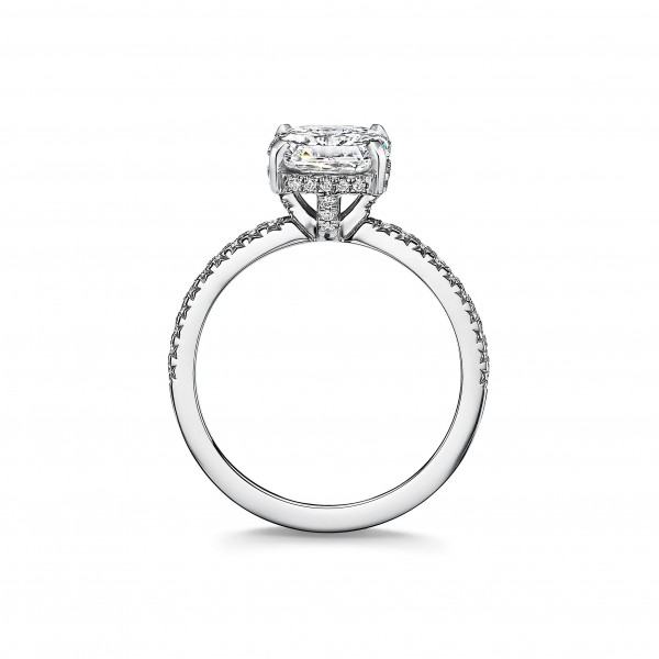 订婚钻戒璀璨夺目,如同光芒四射的骄阳一般。耀眼夺目的公主方形切割主钻由珠链式边镶钻石璀璨簇拥,营造出迷人的光晕效果。公主方形切割主钻的 V 形刻面展现波浪般光芒,在灵动的珠链式边镶钻石衬托下,折射出迷人的光芒。