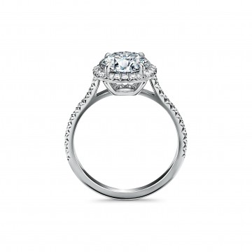 订婚钻戒璀璨夺目,如同光芒四射的骄阳一般。耀眼夺目的枕形切割主钻由双层珠链式边镶钻石璀璨簇拥,营造出迷人的光晕效果。