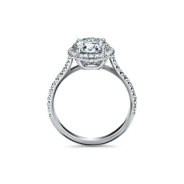 这款获得专利的枕形切割钻石,被珠链式镶嵌的小钻优雅环绕着,令人联想起爱德华时代的雍容华贵。