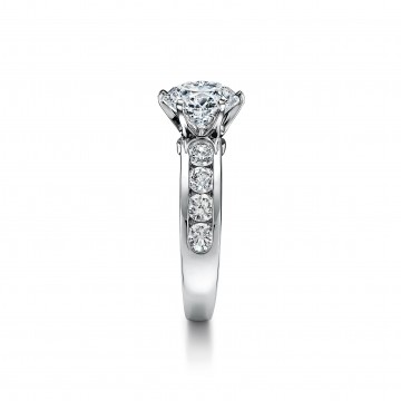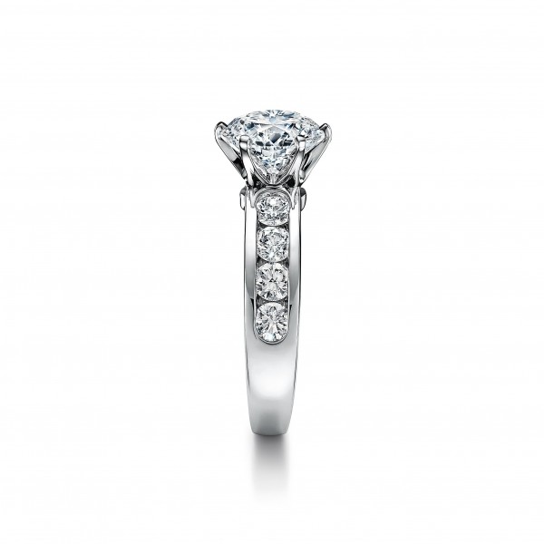 槽式镶嵌圆形明亮式切割钻石的指环与经典的 六爪镶嵌钻戒的闪烁光采璀璨辉映。精湛匠心成就经典杰作,成为世间伟大爱情故事的象征。